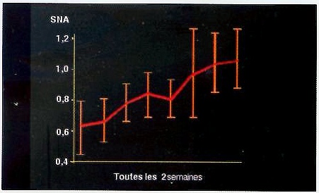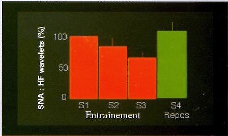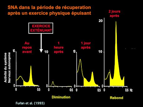 | Des sujets sportifs qui s'entrainent pendant trois mois voient leur activité autonome diminuer progressivement. Lors d'une semaine de repos, on observe un retour de l'activité du S.N.A. avec même un rebond. |